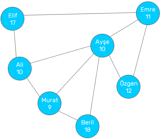 Bir kitap kulübünde 7 öğrenci arasındaki ilişki grafikte gösterilmiştir. Bu grafiğe göre öğrencilerin isimleri ve yaşları bilinmektedir. Kitap kulübünün bazı kuralları vardır: